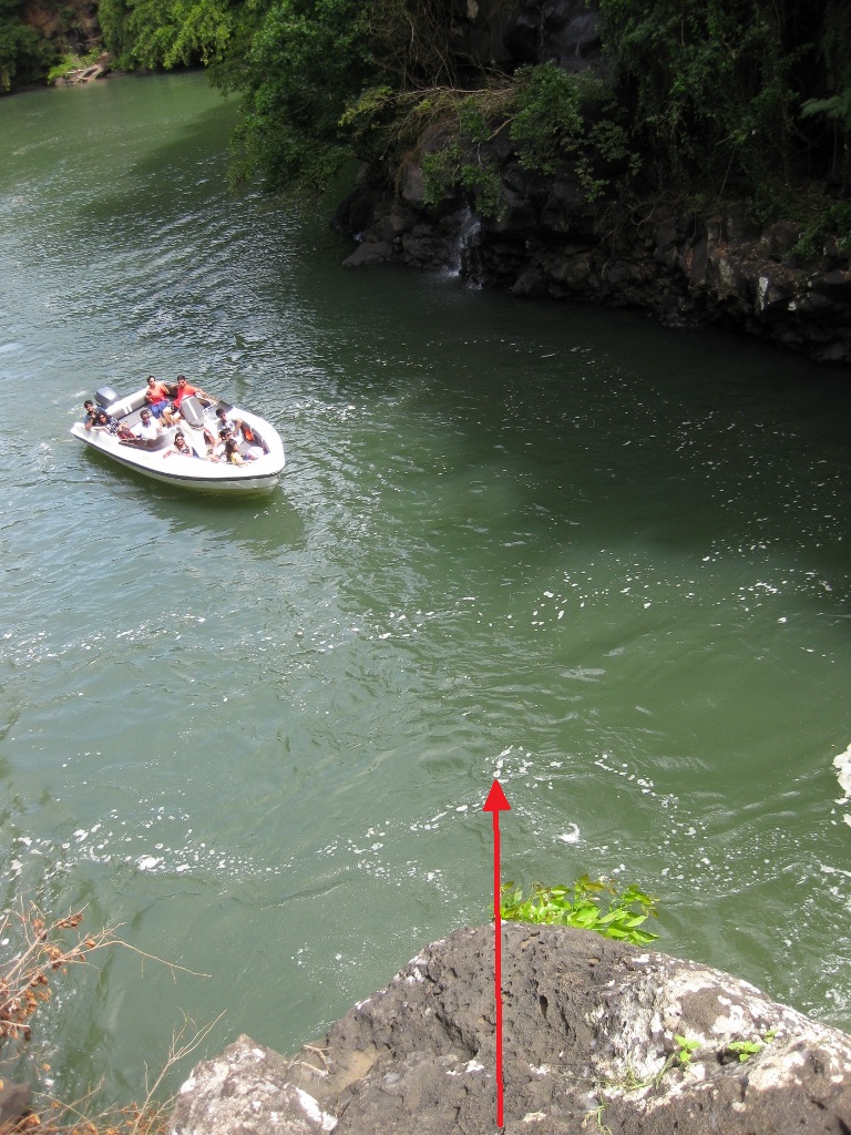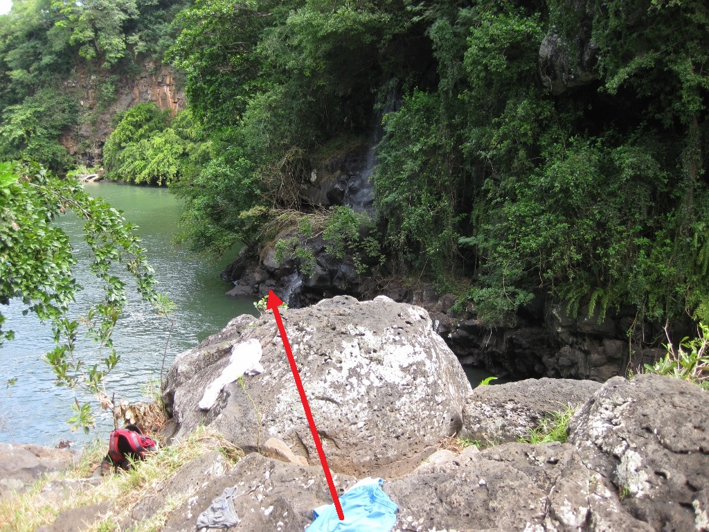 On the north side of the river, just after the bridge, there is a small pull out where you can park. From there descend through the clearing/refuse towards the river. Go to the river bank and begin following it down. There will be a few points, which are obvious, where you cannot continue along the bank (this varies with water level). Find your way around and then stay close to the river. Once you reach the falls you can either jump off rocks of varying heights (see photos) or descend down to water level for a swim just below. The water level will probably vary here during the year, so use your best judgment and jump at your own risk. I drew a few diagrams showing where I jumped from (see photos). I jumped straight out off of the point shown in the pictures. Additionally, there are often locals here that can show you how it is done. Return along the same route.
